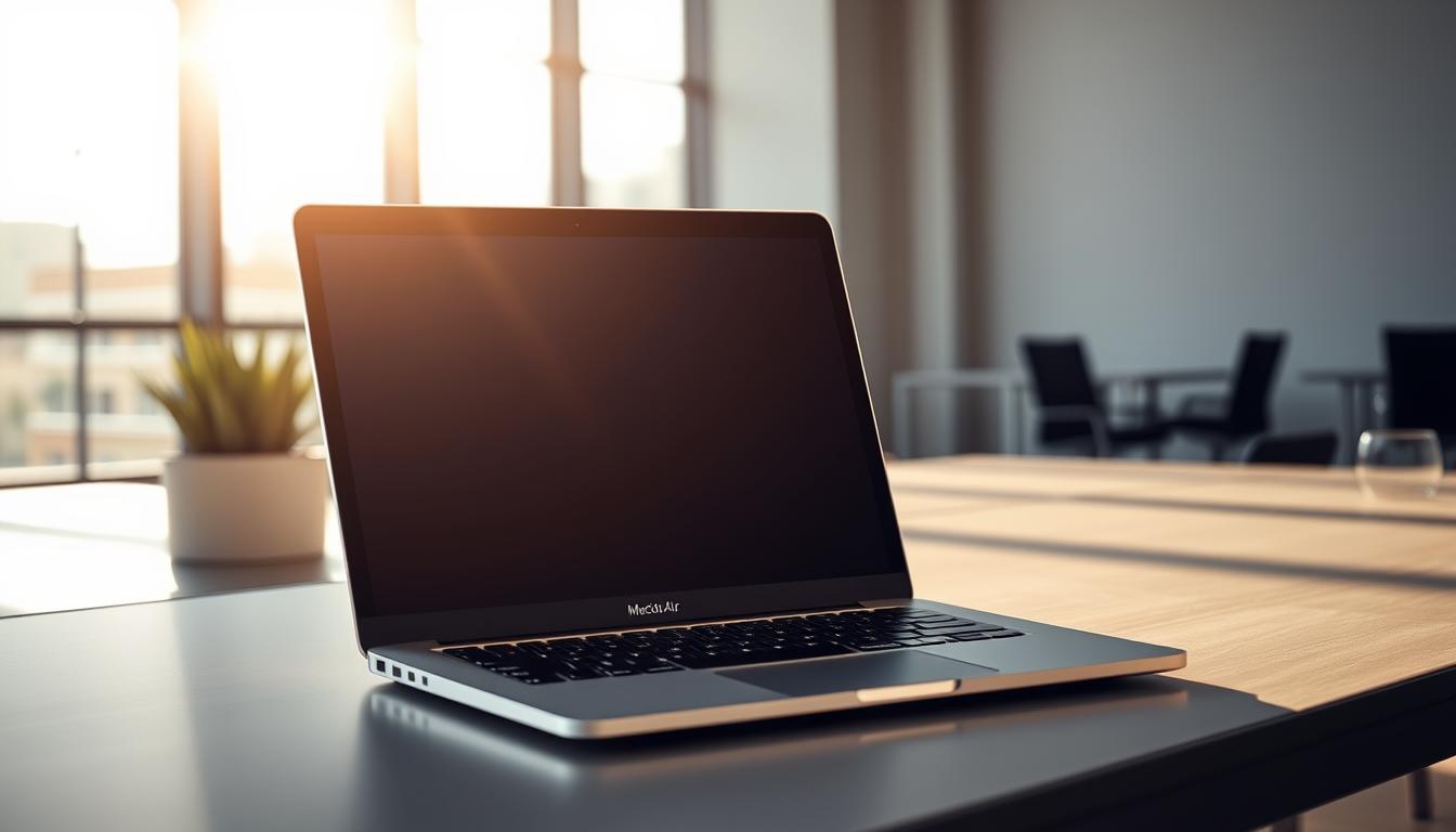 Previous ImageNext Image A-sleek-and-lightweight-MacBook-Air-M3-laptop-positioned-prominently-against-a-backdrop-of-a